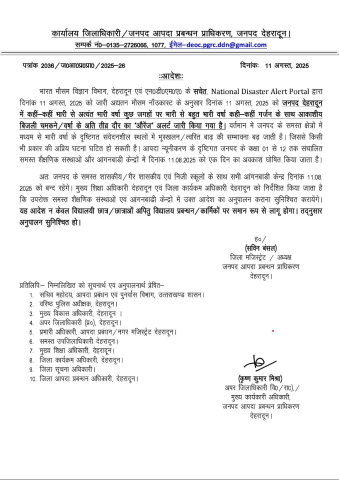 देहरादून के जिलाधिकारी सविन बंसल की ओर से जारी आदेश में बताया गया है कि 11 अगस्त सोमवार को जनपद के सभी कक्षा एक से 12 तक के विद्यालयों और आंगनबाड़ी केंद्रों में अवकाश रहेगा।