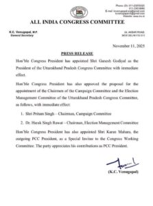 – प्रीतम सिंह को इलेक्शन कैंपेनिंग कमेटी और डॉ. हरक सिंह रावत को इलेक्शन मैनेजमेंट कमेटी का अध्यक्ष बनाया