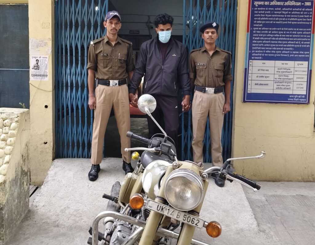 थाना मुनिकीरेती की गठित पुलिस टीम द्वारा करीब 150 से अधिक सीसीटीवी फुटेज को चेक किया गया। जिसमें दो व्यक्तियों का मोटरसाइकिल ले जाना दिखाई दिया। मुखबिर की सूचना के आधार पर पुलिस टीम द्वारा  सोहेल पुत्र शेर मोहम्मद निवासी आराघर थाना डालनवाला देहरादून को बुधवार की रात्रि को में आराघर देहरादून से गिरफ्तार किया गया। पूछताछ करने पर आरोपी ने पुलिस को  बताया कि उक्त बुलेट मोटरसाइकिल शुभम रतूड़ी पुत्र दिनेश चंद्र निवासी कीर्ति नगर तथा सुनील पुत्र उम्मेद सिंह निवासी कीर्ति नगर ने चोरी कर मुझे बेचने के लिए दी थी। आरोपी की निशादेही पर मोटरसाइकिल को बरामद कर किया गया। सोहेल का अंडो का व्यवसाय है। वह समरफील्ड स्कूल देहरादून, चंडीगढ़ यूनिवर्सिटी का छात्र रहा है। इसके अतिरिक्त वह विभिन्न  कॉलेज की स्पोर्ट्स प्रतियोगिता में विजेता प्रतिभागी रहा है। उसके परिवार के परिवारजनों  की देहरादून तथा गाजियाबाद   रिहायशी स्थानों में संपत्तियां है। इस मामले में फरार आरोपी शुभम रतूड़ी पुत्र दिनेश चंद्र निवासी कीर्ति नगर टिहरी गढ़वाल, सुनील पुत्र उम्मेद सिंह निवासी कीर्ति नगर, टिहरी गढ़वाल की गिरफ्तारी के लिए टीमों को रवाना किया गया है।