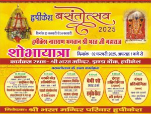 श्री भरत मंदिर के महंत वत्सल प्रपन्नाचार्य द्वारा झंडारोहण के साथ साथ बृहस्पतिवार को ऋषिकेश वसंतोत्सव का आगाज हो गया। इस मौके पर आयोजित स्वर्गीय रामबाबू गोयल स्मृति वसंतोत्सव साइकिल रेस का किताब निर्मल दीप स्कूल के छात्र भानु पयाल ने जीता।