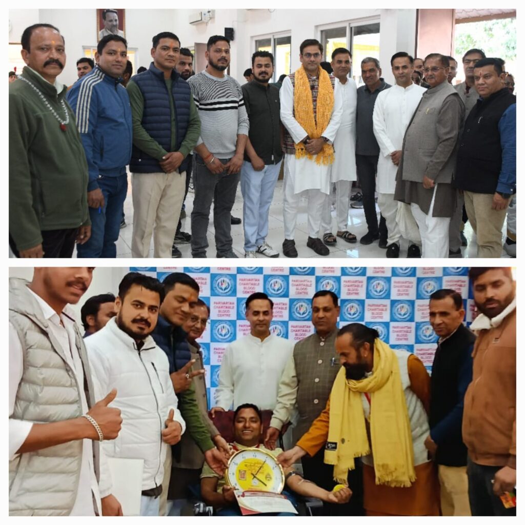 रक्तदान शिविर का उद्घाटन कैबिनेट मंत्री सौरभ बहुगुणा,महंत वत्सल प्रपन्नाचार्य महाराज, हर्षवर्धन शर्मा,पार्षद राजेंद्र प्रेम सिंह बिष्ट, संयोजक दीप शर्मा,सहसंयोजक वरुण शर्मा द्वारा किया गया। मुख्य अतिथि कैबिनेट मंत्री सौरभ बहुगुणा ने कहा कि यहां पर प्रत्येक व्यक्ति दिल से रक्तदान करने के लिए आ रहा है और रक्तदाताओं को काफी देर तक अपना नंबर आने का इंतजार करना पड़ रहा है लेकिन वह खुशी-खुशी रक्तदान कर रहे हैं। चार चार अस्पतालों और सैकड़ो रक्तदाताओं को मैनेज करना वास्तव में एक बहुत बड़े मैनेजमेंट का प्रतीक है।
