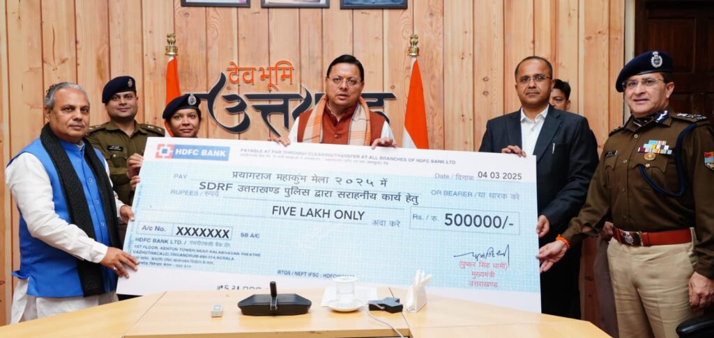 देहरादून: हरिद्वार कुंभ में प्रयागराज महाकुंभ के अनुभव काम आयेंगे। एसडीआरएफ टीम ने महाकुंभ में अपनी दक्षता का कुशल परिचय देकर उत्तराखंड का मान बढ़ाया है। यह बात सीएम पुष्कर सिंह धामी ने सीएम आवास में एसडीआरएफ के 112 कार्मिकों के वापस आने पर आयोजित महाकुंभ प्रयागराज 2025 अभिनन्दन कार्यक्रम में बात कही। इस मौके पर उन्होंने एसडीआरएफ की टीम को पुरस्कार स्वरूप पांच लाख रुपए का चेक भी सौंपा।