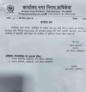 ऋषिकेश: नगर निगम ऋषिकेश में मेयर शंभू पासवान और नगर आयुक्त शैलेंद्र सिंह नेगी के मध्य उपजे विवाद के बीच मेयर की ओर से कल यानी शुक्रवार को बुलाई गई बोर्ड की बैठक को निरस्त कर दिया गया है। संबंधित नोटिस में बैठक को निरस्त करने का कारण कार्यहिट बताया गया है।