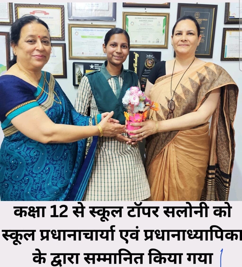 कक्षा 12 से स्कूल टॉपर सलोनी को स्कूल प्रधानाचार्या एवं प्रधानाध्यापिका के द्वारा सम्मानित किया गया। विद्यालय के संस्थापक महंत बाबा राम सिंह जी महाराज एवं संचालक संत बाबा जोध सिंह महाराज जी ने छात्रों की इस गौरवपूर्ण उपलब्धि पर हर्ष व्यक्त करते हुए सभी विद्यार्थियों, शिक्षकों एवं अभिभावकों को हार्दिक बधाई एवं शुभकामनाएं प्रेषित कीं। विद्यालय के चेयरमैन डॉ. एस. एन. सूरी, प्रधानाचार्या डॉ. सुनीता शर्मा तथा प्रधानाध्यापिका अमृतपाल डंग ने भी विद्यार्थियों के अथक परिश्रम एवं शिक्षकों के समर्पण की प्रशंसा करते हुए सभी को बधाई दी।