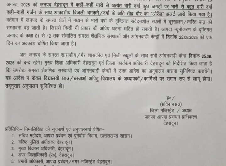सोमवार को जनपद देहरादून के विद्यालयों में रहेगा अवकाश उत्तराखण्ड सोमवार को जनपद देहरादून के विद्यालयों में रहेगा अवकाश न्यूज़ दस्तक100 August 24, 2025 25 अगस्त को देहरादून के स्कूल बंद रहेंगे देहरादून। भारी बारिश की चेतावनी के कारण 25 अगस्त...Read More
